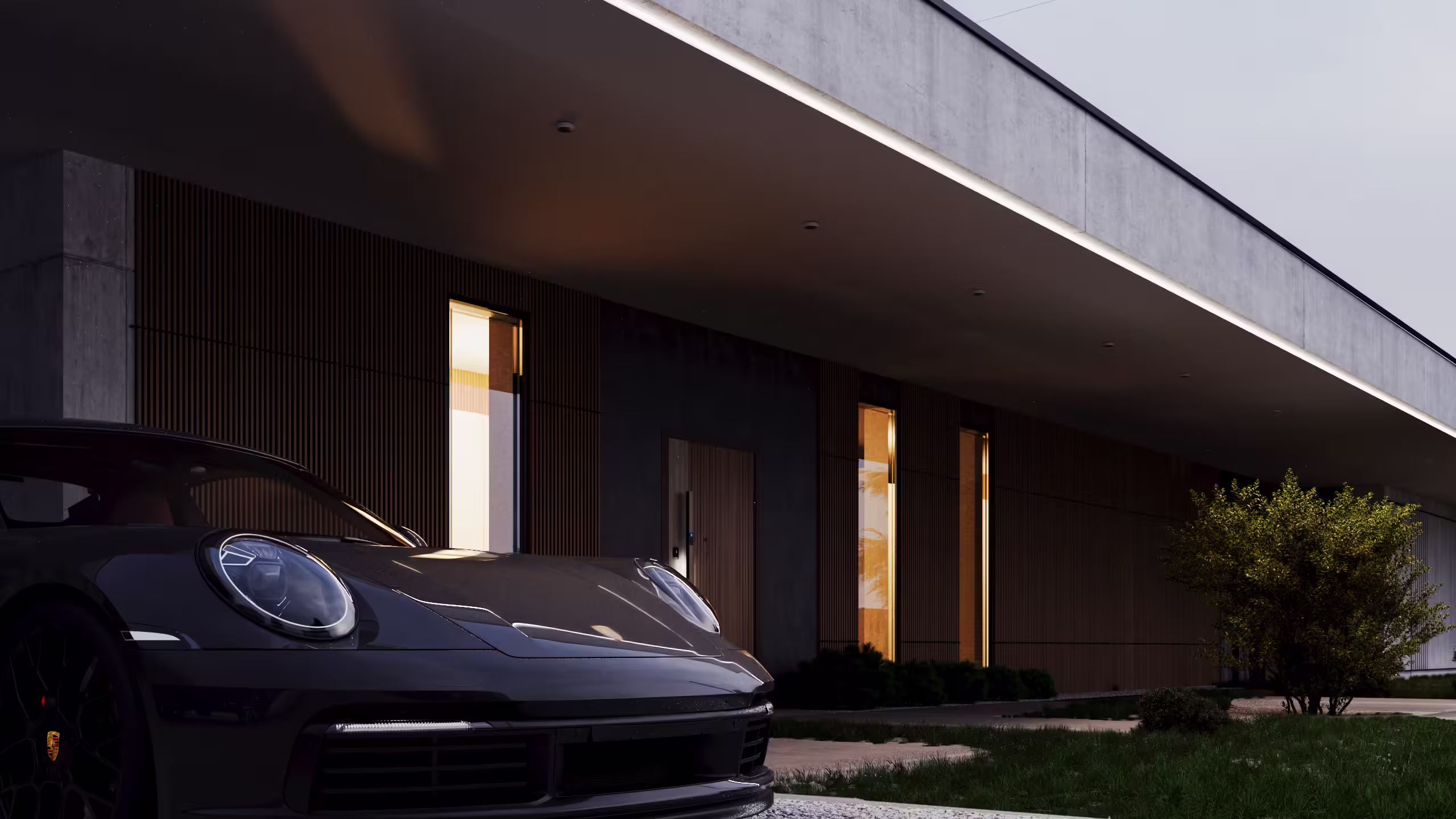 Большие консольные свесы, разноуровневая кровля и сочетание бетона с деревом и стеклом делают экстерьер выразительным и динамичным.